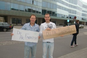 Min bror sa genast, det här måste vi göra hemma i Sverige. Sedan gick tiden och jag antar att vi också drog oss lite för det, det kändes ändå lite läskigt. Men vid ett tillfälle kom jag över några skyltar och dekorerade dem med orden ”Du är fantastisk” och sa att nu gör vi det bara. Sagt och gjort, i morse mellan kvart i åtta till klockan åtta på morgonen stod vi på en av Malmös mest trafikerade cykelbroar över kanalen och hälsade morgonens cyklister och gående med orden: ”Godmorgon, du är fantastisk!” samtidigt som vi höll upp skylten.